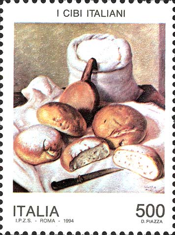 La vignetta policroma illustra il più classico dei cibi italiani: il pane.